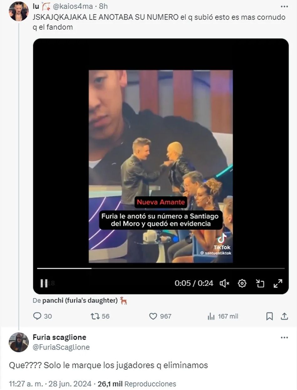 Sin embargo, ante tantas reacciones, Furia se hizo eco de este video y se encargó de desmentir esta versión de un supuesto romance con el conductor de GH. "Le anotaba su número...", escribió una usuaria en X, a lo que ella lanzó con absoluto asombro: "¿Qué?".