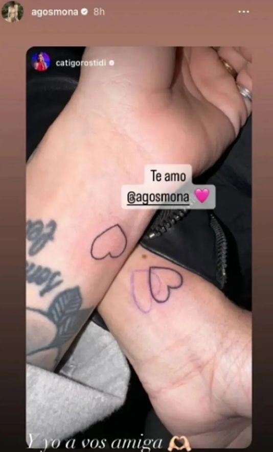 Cata y Agos decidieron grabarse un simple corazón en sus muñecas, un símbolo del cariño que se tienen y así lo demostraron en sus historias de Instagram. “Te amo”, publicó la médica santafesina en sus redes, y luego Spinelli reposteó la foto y le respondió: “Y yo a vos, amiga”.