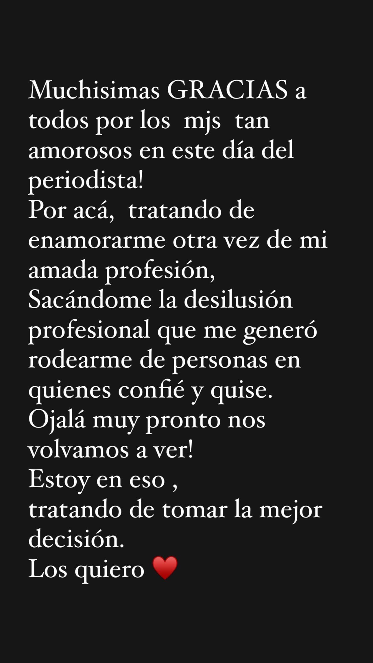 Luego, la comunicadora enfatizó: "Ojalá muy pronto nos volvamos a ver! Estoy en eso, tratando de tomar la mejor decisión. Los quiero".
