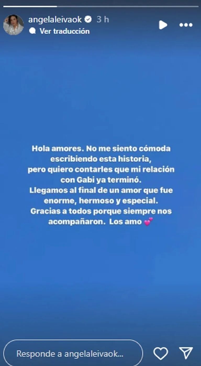 Este viernes, Ángela Leiva sorprendió a todos al anunciar su separación de Gabriel Mikelovich. "Hola, amores. No me siento cómoda escribiendo esta historia, pero quiero contarles que mi relación con Gabi ya terminó. Llegamos al final de un amor que fue enorme, hermoso y especial. Gracias a todos porque siempre nos acompañaron. Los amo", expresó la cantante de música tropical en una historia de Instagram (@Angelaleivaok).