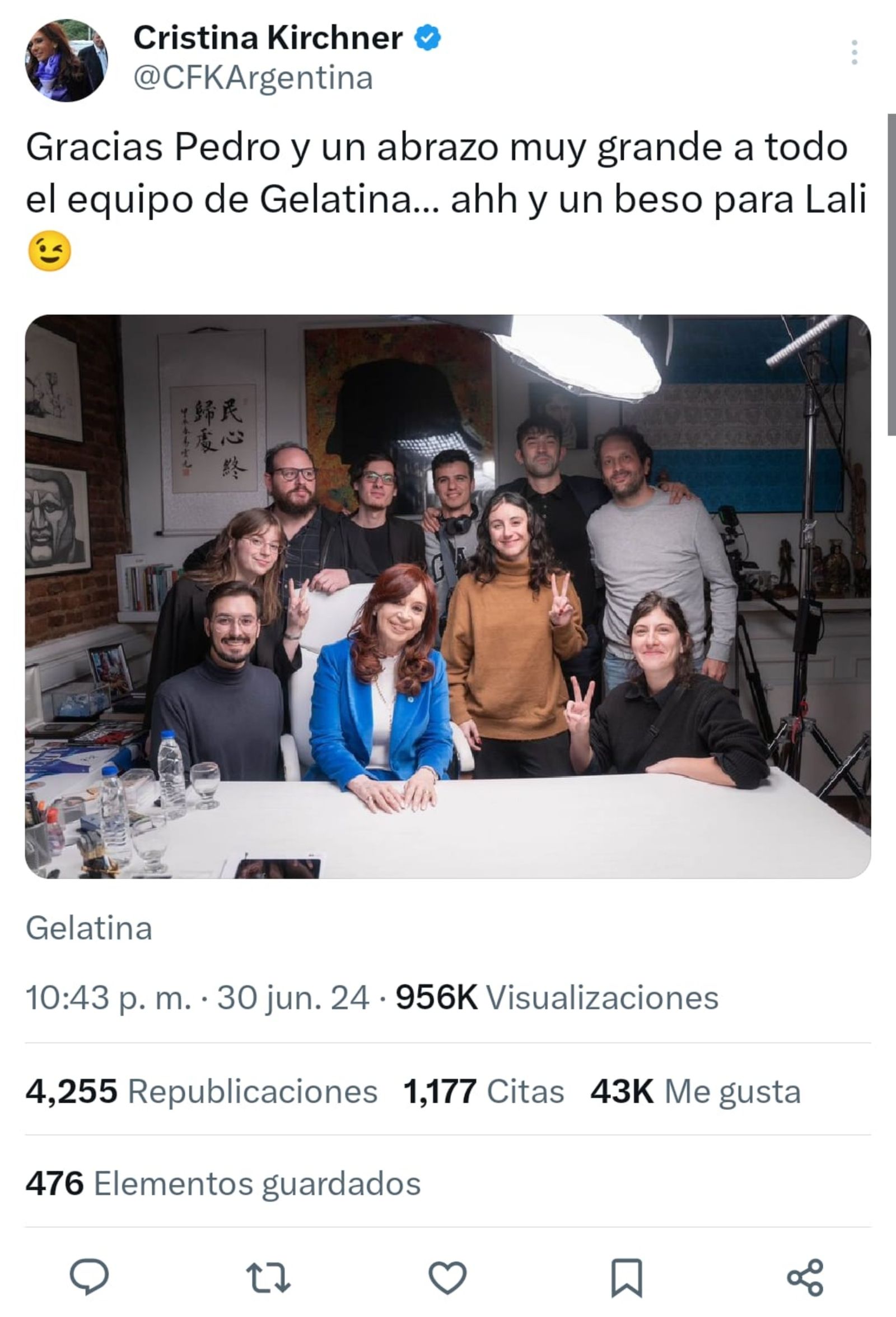 La entrevista de Cristina Fernández de Kirchner con Pedro Rosemblat tuvo un pico de 100.000 espectadores. Luego de aquella nota, la exmandataria compartió una imagen en X (@CFKArgentina) junto al equipo de Gelatina. En su posteo, le agradeció a Pedro y a la producción del canal de streaming. Y no se olvidó de Lali Espósito.