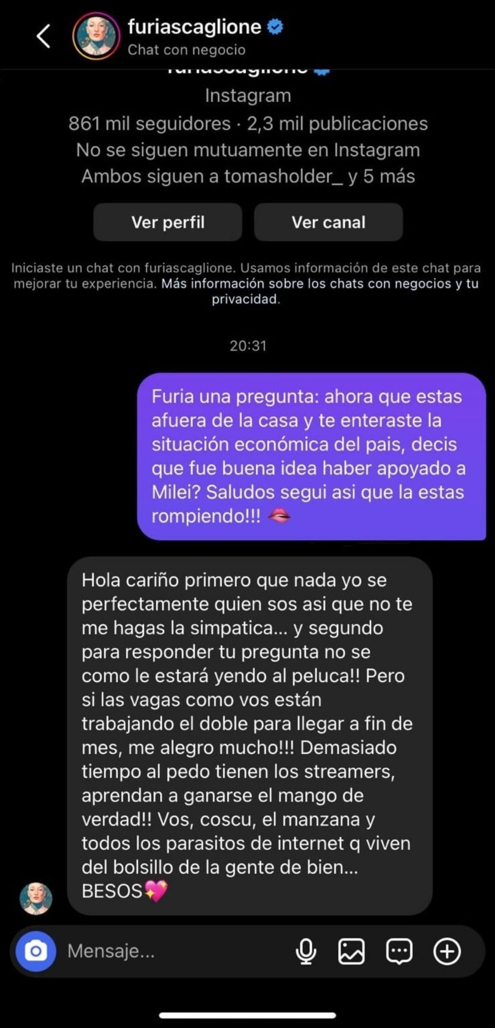 "Furia, una pregunta: ahora que estás afuera de la casa y te enteraste la situación económica del país, ¿decís que fue buena idea haber apoyado a Milei? Saludos, ¡¡¡seguí así que la estas rompiendo!!!", fue el mensaje que le envió la youtuber a Scaglione.