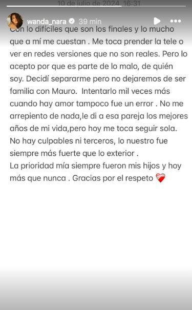 "Con lo difíciles que son los finales y la mucho que a mí me cuestan. Me toca prender la tele o ver en redes versiones que no son reales. Decidí separarme pero no dejaremos de ser familia con Mauro", expresó en un texto publicado en sus historias de Instagram.