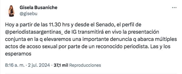 "Hoy a partir de las 11.30 hrs y desde el Senado, el perfil de @periodistasargentinas_ de IG transmitirá en vivo la presentación conjunta en la q elevaremos una importante denuncia q abarca múltiples actos de acoso sexual por parte de un reconocido periodista. Las y los esperamos", compartió Busaniche.