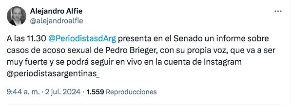 En este sentido, el periodista Alejandro Alfie también sumó detalles. "A las 11.30 @PeriodistasdArg presenta en el Senado un informe sobre casos de acoso sexual de Pedro Brieger, con su propia voz, que va a ser muy fuerte y se podrá seguir en vivo en la cuenta de Instagram @periodistasargentinas_", compartió en sus redes.