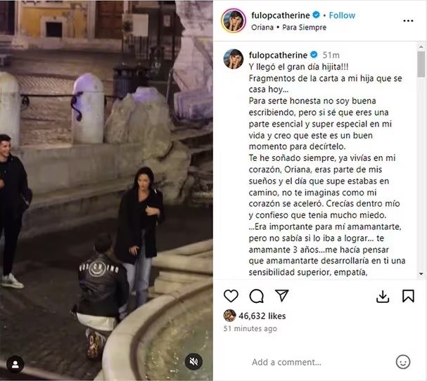 A través de su perfil de Instagram, Catherine Fulop compartió el tierno video de la propuesta de casamiento que el futbolista le hizo a la cantante en uno de los puntos más emblemáticos y bellos de Roma: la Fontana di Trevi. Junto a este clip escribió unas sentidas palabras hacia su primogénita.