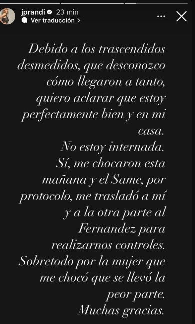 A las horas, la propia actriz y conductora publicó desde su cuenta de Instagram una historia con un texto, aclarando su estado de salud. "Debido a los trascendidos desmedidos, que desconozco cómo llegaron a tanto, quiero aclarar que estoy perfectamente bien y en mi casa. No estoy internada. Sí, me chocaron esta mañana y el SAME, por protocolo, me trasladó a mí y a la otra parte al Fernández para realizarnos controles. Sobre todo por la mujer que me chocó que se llevó la peor parte. Muchas Gracias" cerró Julieta Prandi.