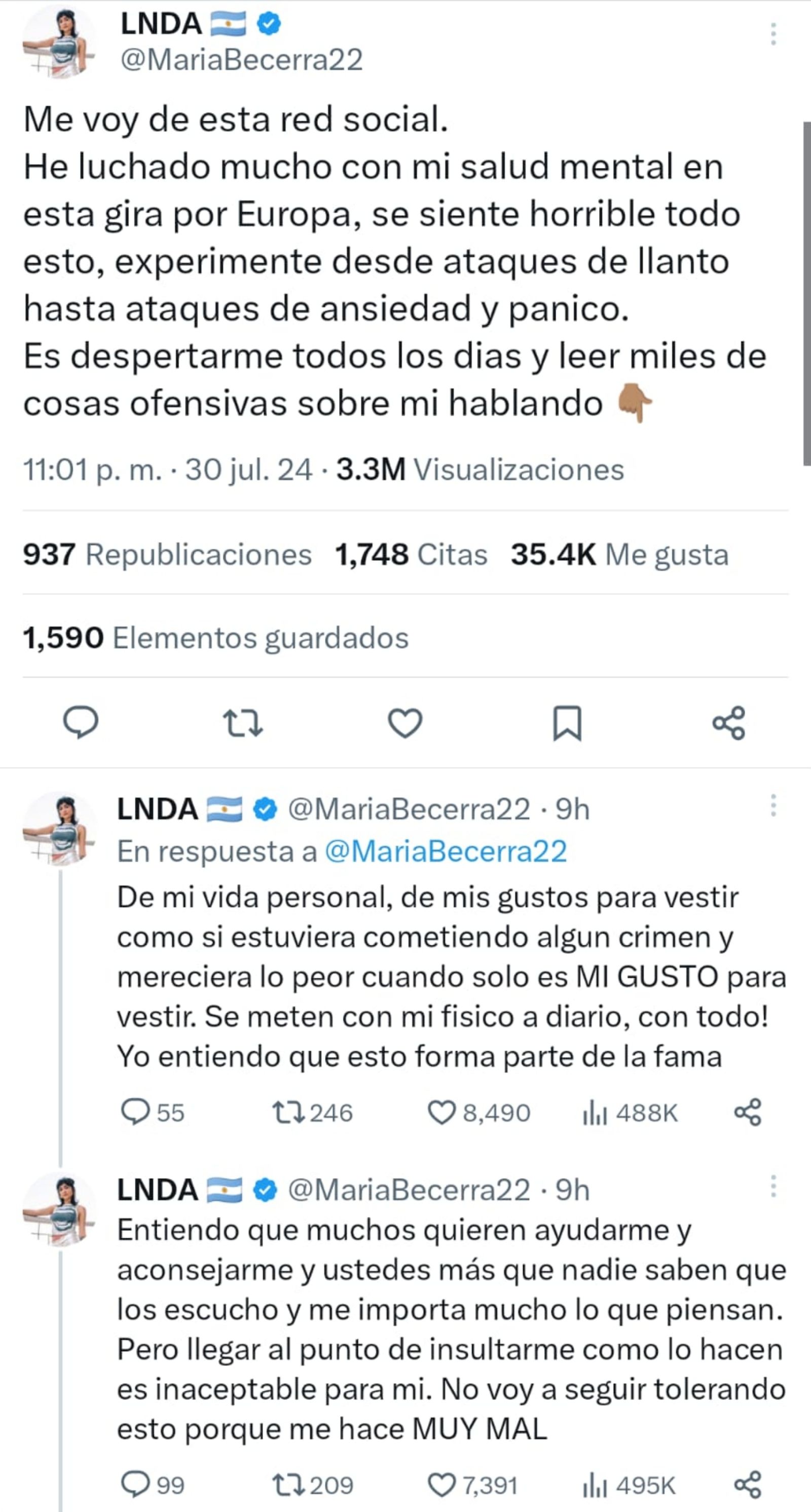 "Me voy de esta red social. He luchado mucho con mi salud mental en esta gira por Europa, se siente horrible todo esto, experimente desde ataques de llanto hasta ataques de ansiedad y pánico. Es despertarme todos los días y leer miles de cosas ofensivas sobre mi hablando De mi vida personal, de mis gustos para vestir como si estuviera cometiendo algún crimen y mereciera lo peor cuando solo es MI GUSTO para vestir. Se meten con mi físico a diario, ¡con todo!", confesó María Becerra.