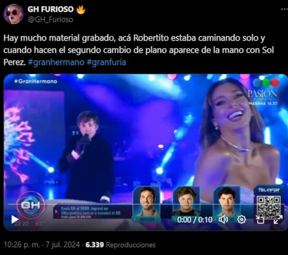 “Hay mucho material grabado. Acá Robertito estaba caminando solo y cuando hacen el segundo cambio de plano aparece de la mano con Sol Pérez”, dijo un usuario de la ex red del pajarito, al marcar el momento de la previa que llamó la atención.
