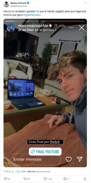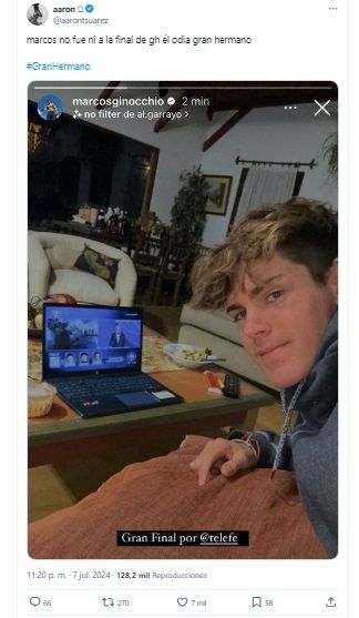 El nacido en Salta hace 24 años subió una foto a su perfil de Instagram en la que se lo ve desde su casa presenciando el programa, desde su computadora y cómodamente en el sillón. Rápidamente en las redes se tomaron con mucho humor esto, ya que consideran que se trata de la notoria falta de interés por esta nueva edición, sin decir presente en el desenlace.