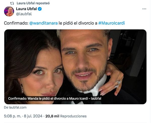 El vínculo matrimonial entre Wanda Nara y Mauro Icardi estaría terminado. Al menos así lo confirmó hace minutos Laura Ubfal desde sus redes sociales y su sitio de espectáculos. "Confirmado: @wanditanara le pidió el divorcio a #MauroIcardi", expresó la periodista, dando por sentado el final de diez años de relación entre la empresaria y el futbolista.