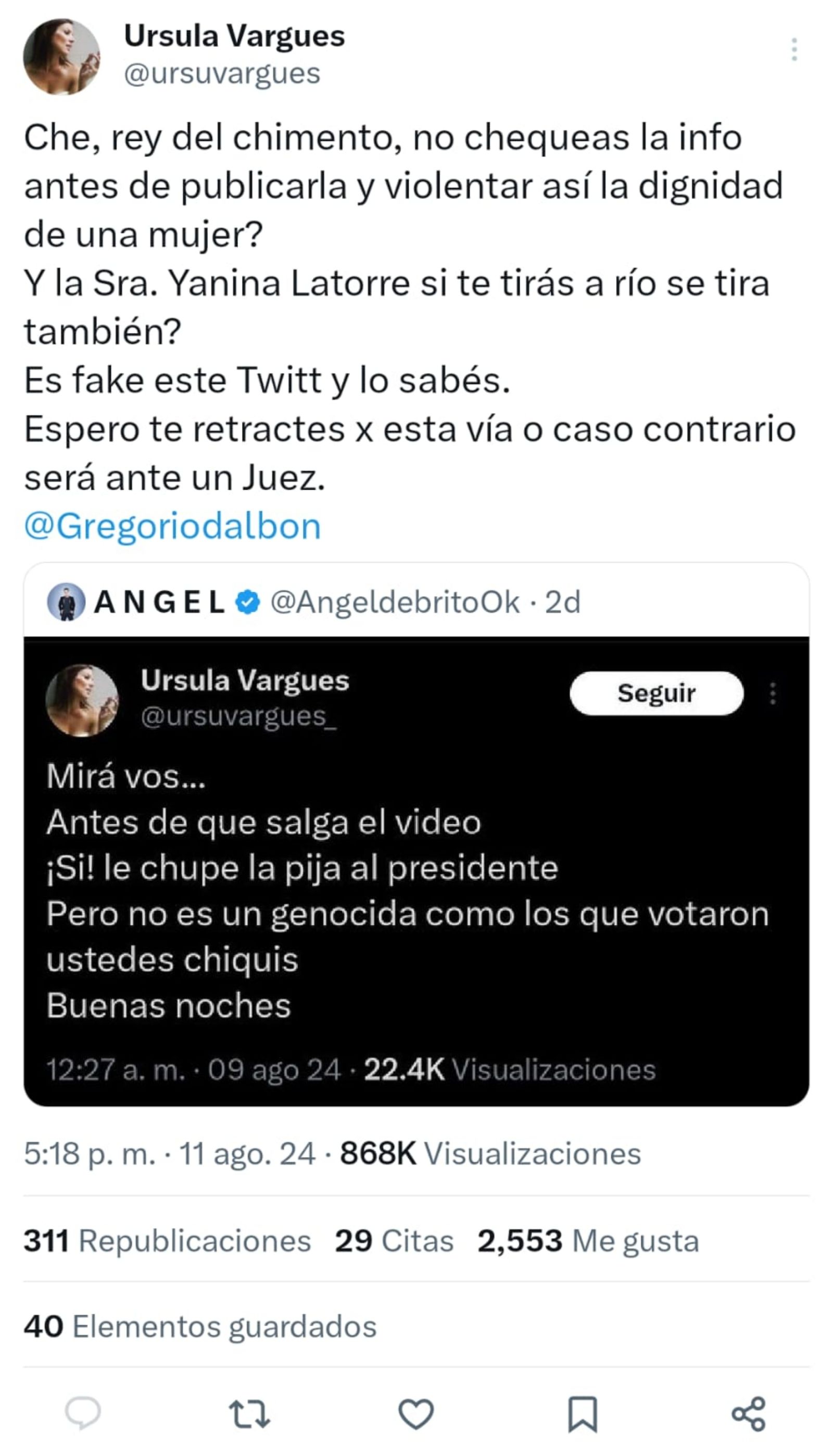 Uno de los periodistas que compartió el posteo fue Ángel de Brito, y Úrsula Vargues no dudó en responderle al conductor de Los Ángeles de la Mañana (LAM): "Che, rey del chimento, ¿no chequeas la info antes de publicarla y violentar así la dignidad de una mujer? Y la Sra. Yanina Latorre, ¿si te tirás al río se tira también?".