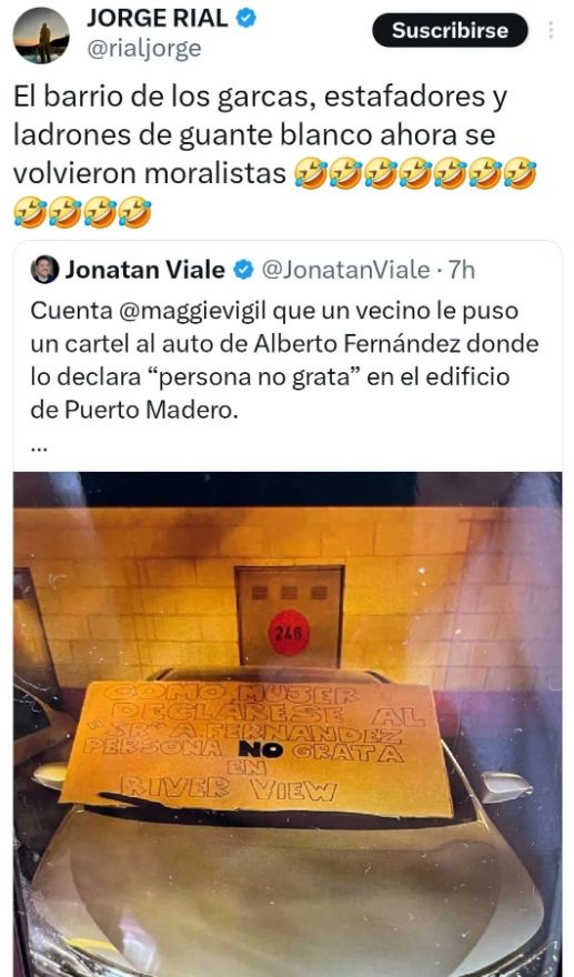 “Cuentan que un vecino le puso un cartel en el auto de Alberto Fernández en el que lo declara persona no grata en el edificio de Puerto Madero”, había señalado Jonatan Viale en X. Entonces, el conductor de Argenzuela no dudó en lanzar un picante retuit lleno de ironía para su colega y las personas que residen en el barrio más lujoso de CABA.