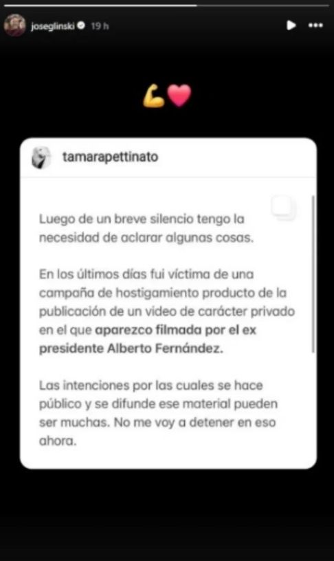 ¿Y qué hizo el compañero de Tamara? Compartió en sus historias de Instagram el posteo de la hija de Roberto Pettinato para darle más alcance y, como clara señal de apoyo, le sumó un corazón rojo y un emoji de “fuerza”.