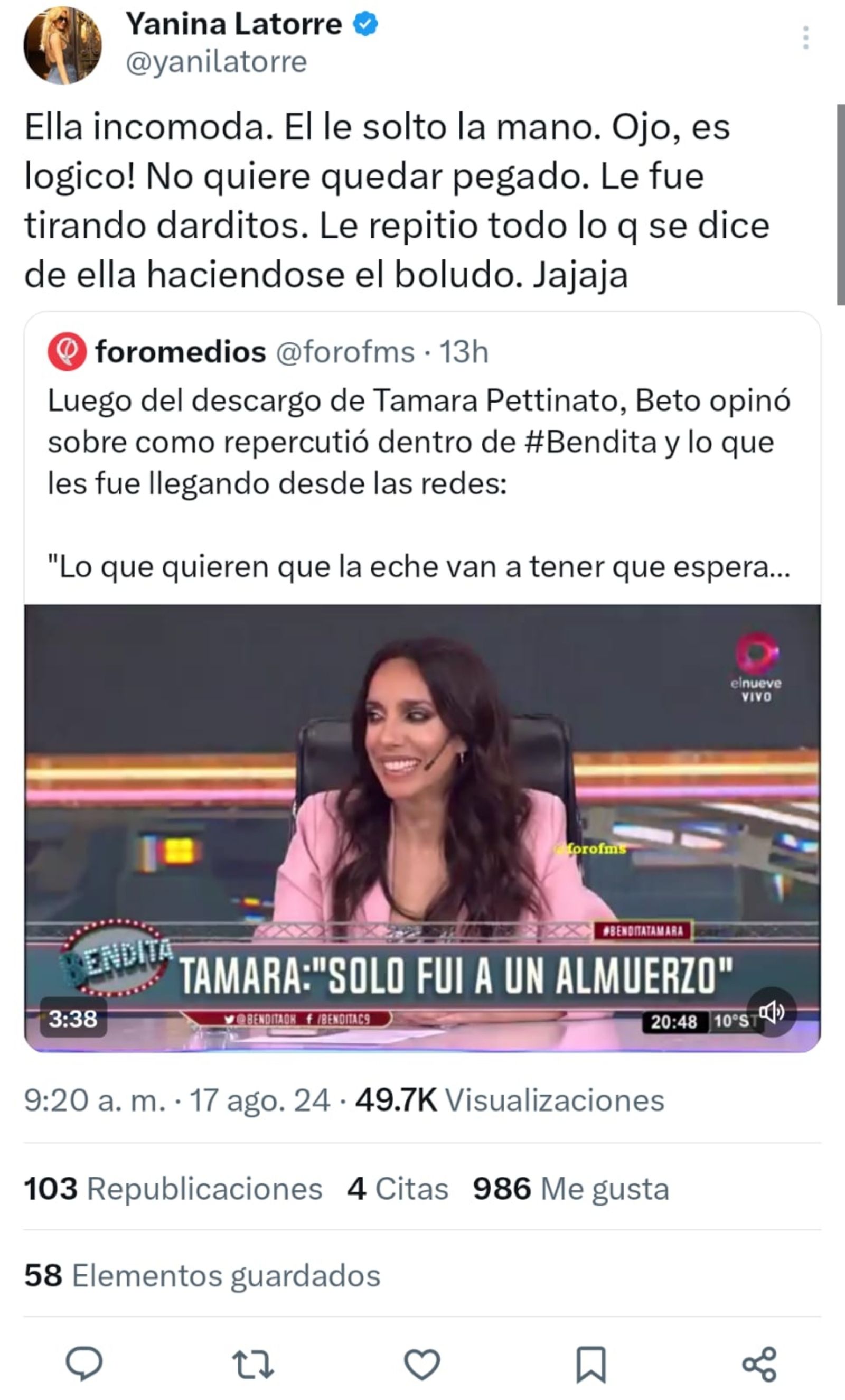 "Ella incómoda. Él le soltó la mano. Ojo, ¡es lógico! No quiere quedar pegado. Le fue tirando darditos. Le repitió todo lo que se dice de ella haciéndose el boludo. Jajaja", fue la observación que hizo la periodista de espectáculos en su cuenta de X.