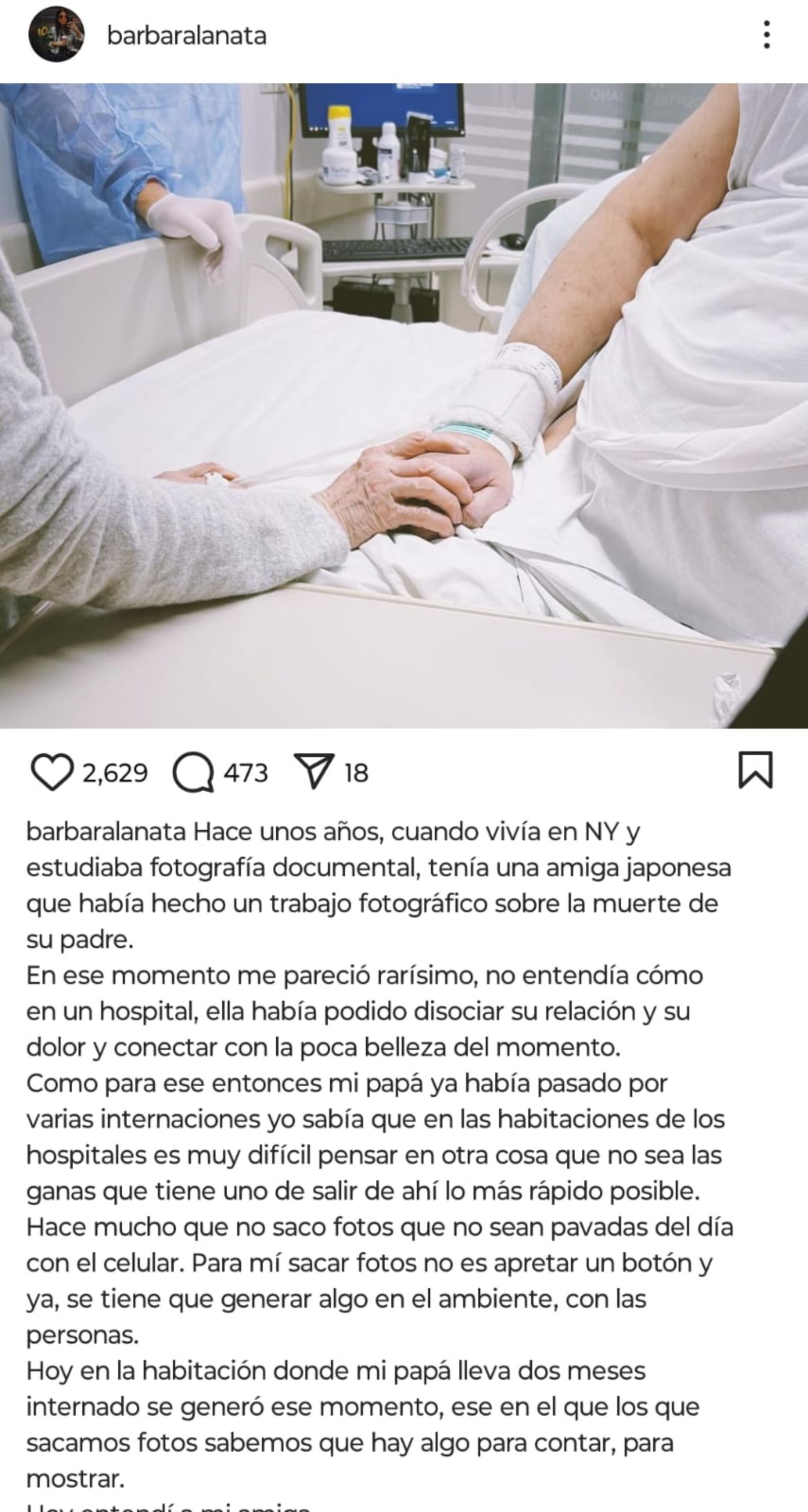 "Como para ese entonces mi papá ya había pasado por varias internaciones yo sabía que en las habitaciones de los hospitales es muy difícil pensar en otra cosa que no sea las ganas que tiene uno de salir de ahí lo más rápido posible. Hace mucho que no saco fotos que no sean pavadas del día con el celular. Para mí sacar fotos no es apretar un botón y ya, se tiene que generar algo en el ambiente, con las personas", expresó la hija del periodista.