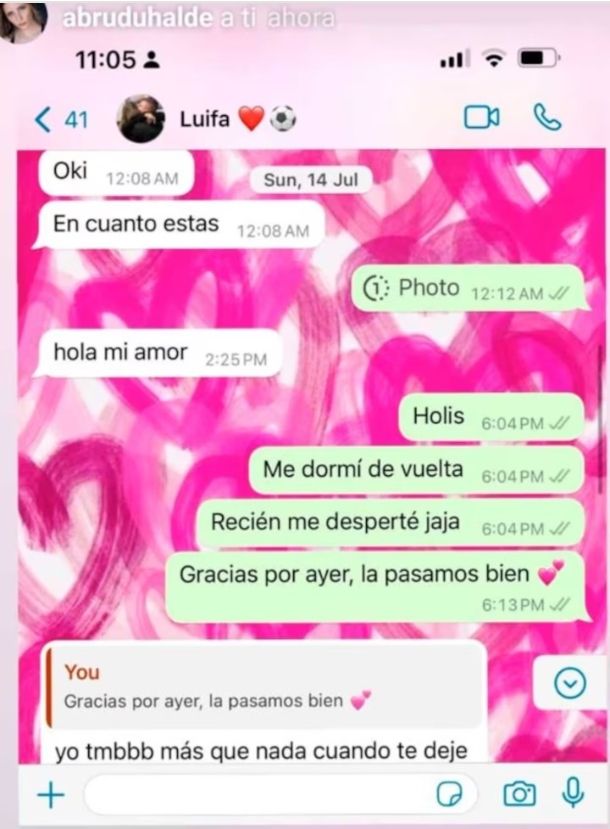 Se debe a que en las conversaciones se lo puede ver a Luifa Galesio, ganador de Gran Hermano 2015, dialogando con la modelo Abril Duhalde. Allí, él le escribió: “Hola, mi amor”. A lo que ella le responde luego de un tiempo y le puso: “Gracias por ayer, la pasamos bien”.