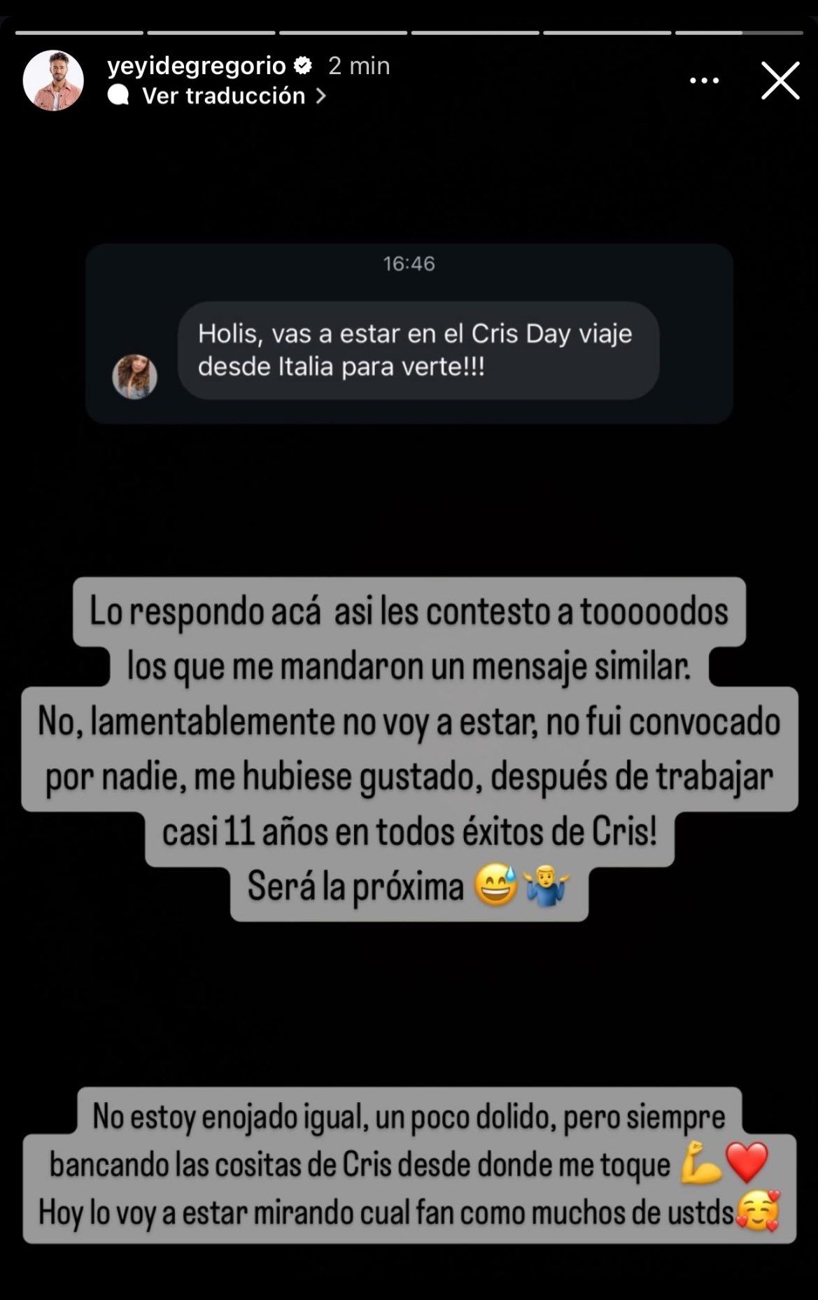 Yeyo publicó una historia en su cuenta de Instagram donde dijo “No, lamentablemente no voy a estar, no fui convocado por nadie. Me hubiese gustado, después de trabajar casi 11 años en todos los éxitos de Cris. Será la próxima. No estoy enojado igual, un poco dolido, pero siempre bancando las cositas de Cris desde donde me toque”. Recordemos que no sólo participó en cuatro series, sino que fueron de las más exitosas: “Rincón de Luz”, “Floricienta”, “Chiquititas” y “Casi Ángeles”.