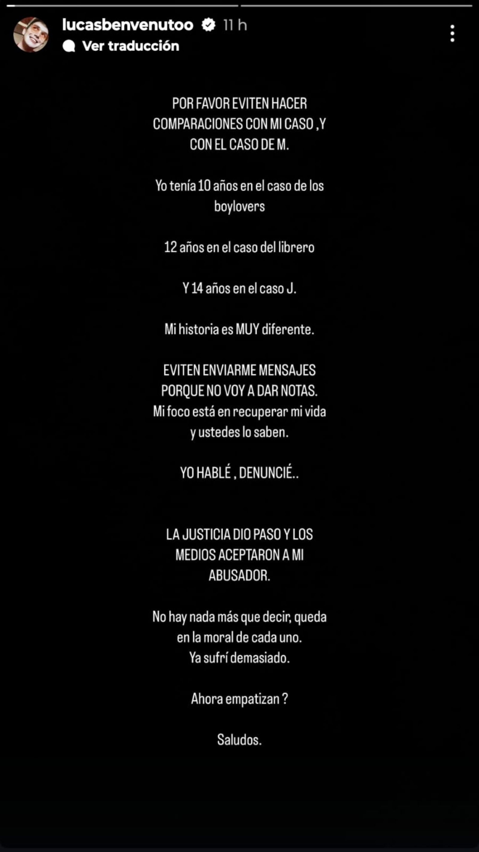 "Por favor, eviten hacer comparaciones con mi caso, y con el caso de M. Yo tenía 10 años en el caso de los boylovers.12 años en el caso del librero. Y 14 años en el caso J", empieza diciendo el comunicado de Lucas Benvenuto.