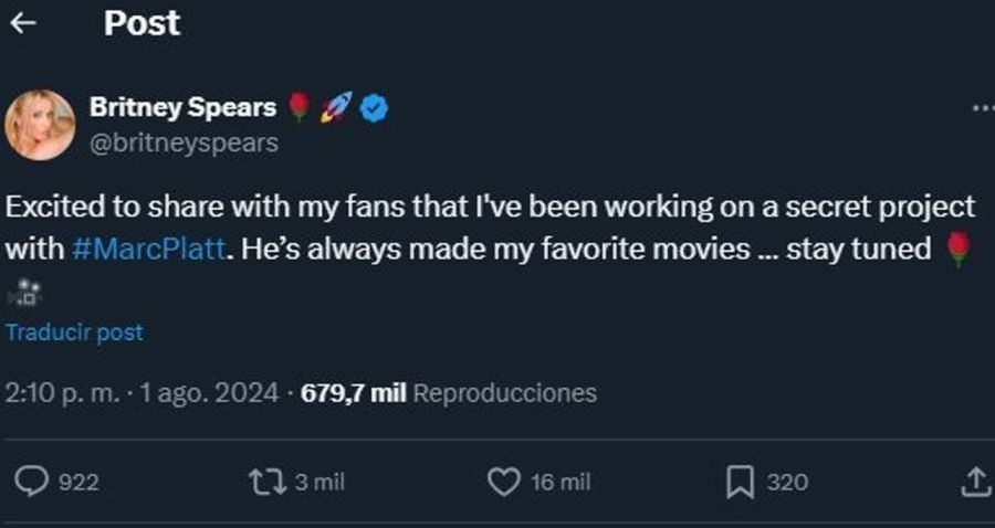 La propia Britney Spears compartió la noticia del proyecto en sus redes sociales, emocionada y confesando que Platt "siempre ha hecho mis películas favoritas" y diciendo a sus fans que "estén atentos" para más noticias.