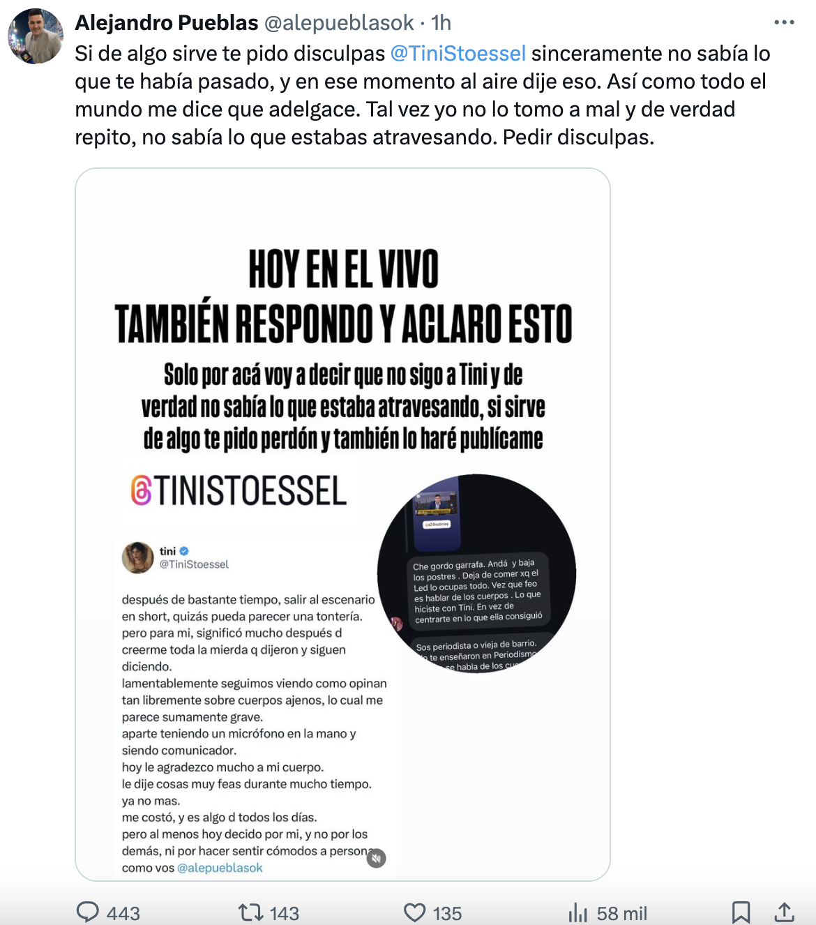 "Si de algo sirve te pido disculpas", comienza el mensaje en Twitter de Pueblas arrobando a Tini.