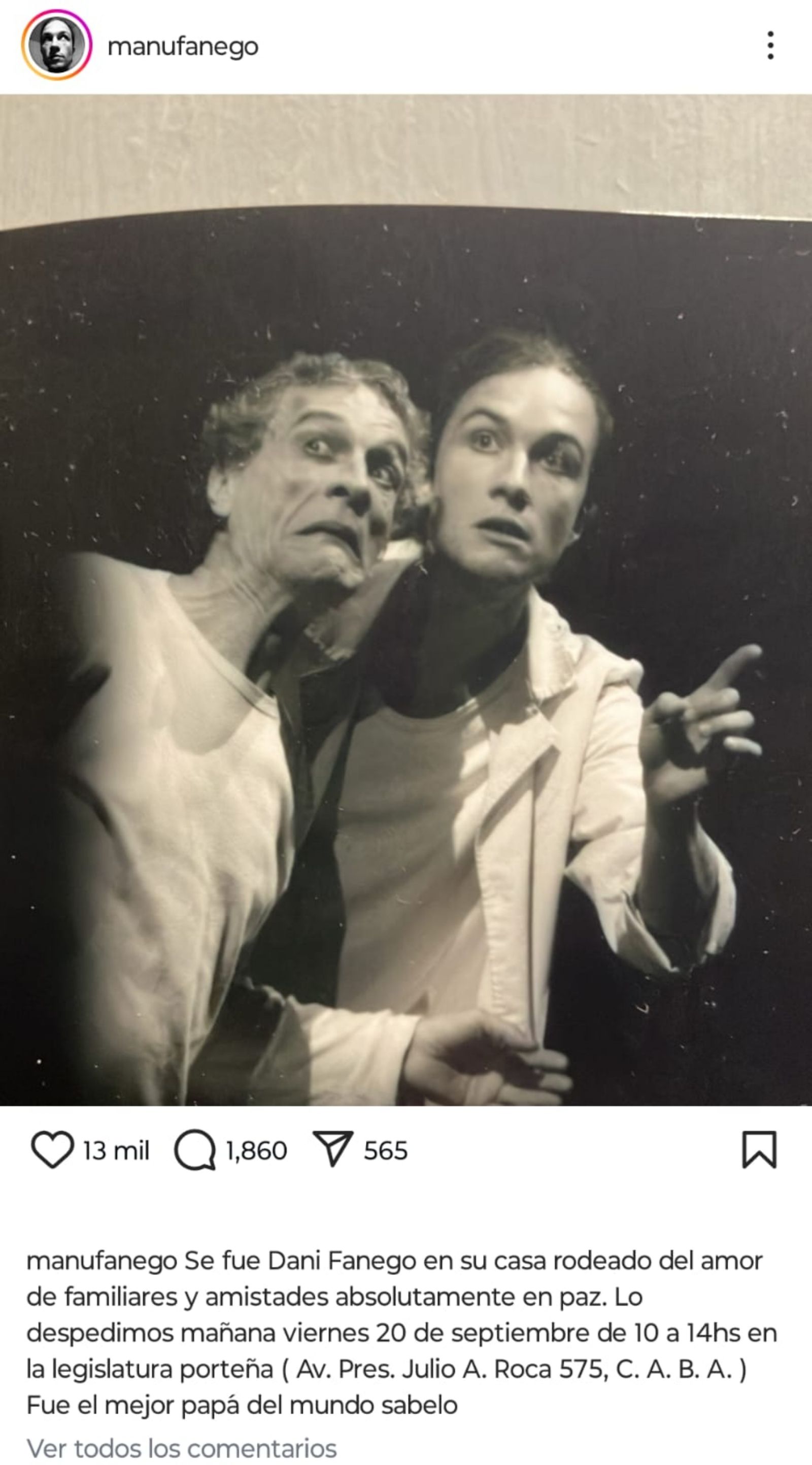 Manuel Fanego, hijo de Daniel, realizó un posteo en su cuenta de Instagram (@Manufanego) para despedir a su padre. "Se fue Dani Fanego en su casa rodeado del amor de familiares y amistades absolutamente en paz. Lo despedimos mañana viernes 20 de septiembre de 10 a 14hs en la legislatura porteña (Av. Pres. Julio A. Roca 575, C.A.B.A). Fue el mejor papá del mundo, sabelo", fueron las sentidas palabras del artista.