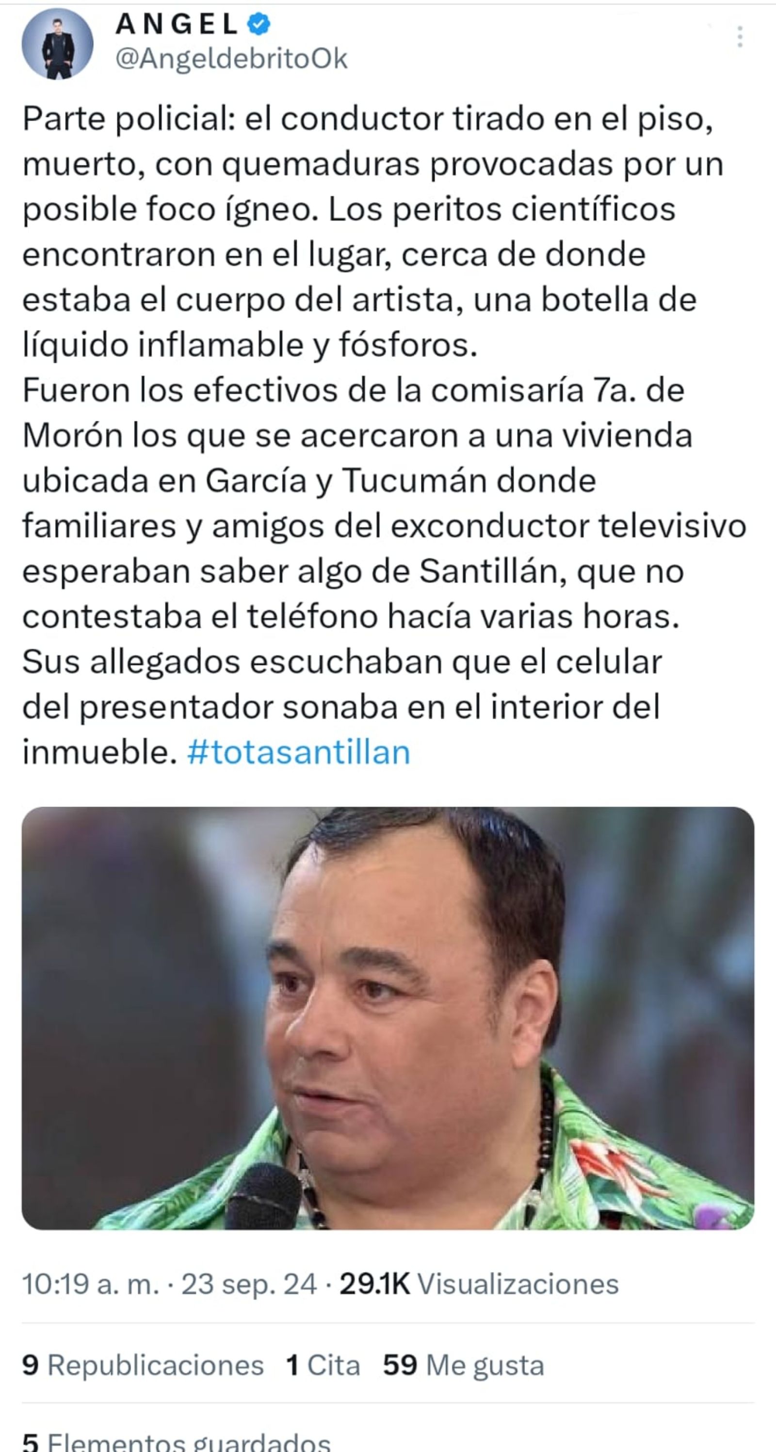 Y añadió: "Fueron los efectivos de la comisaría 7a. de Morón los que se acercaron a una vivienda ubicada en García y Tucumán, donde familiares y amigos del exconductor televisivo esperaban saber algo de Santillán, que no contestaba el teléfono hacía varias horas. Sus allegados escuchaban que el celular del presentador sonaba en el interior del inmueble. #totasantillan".