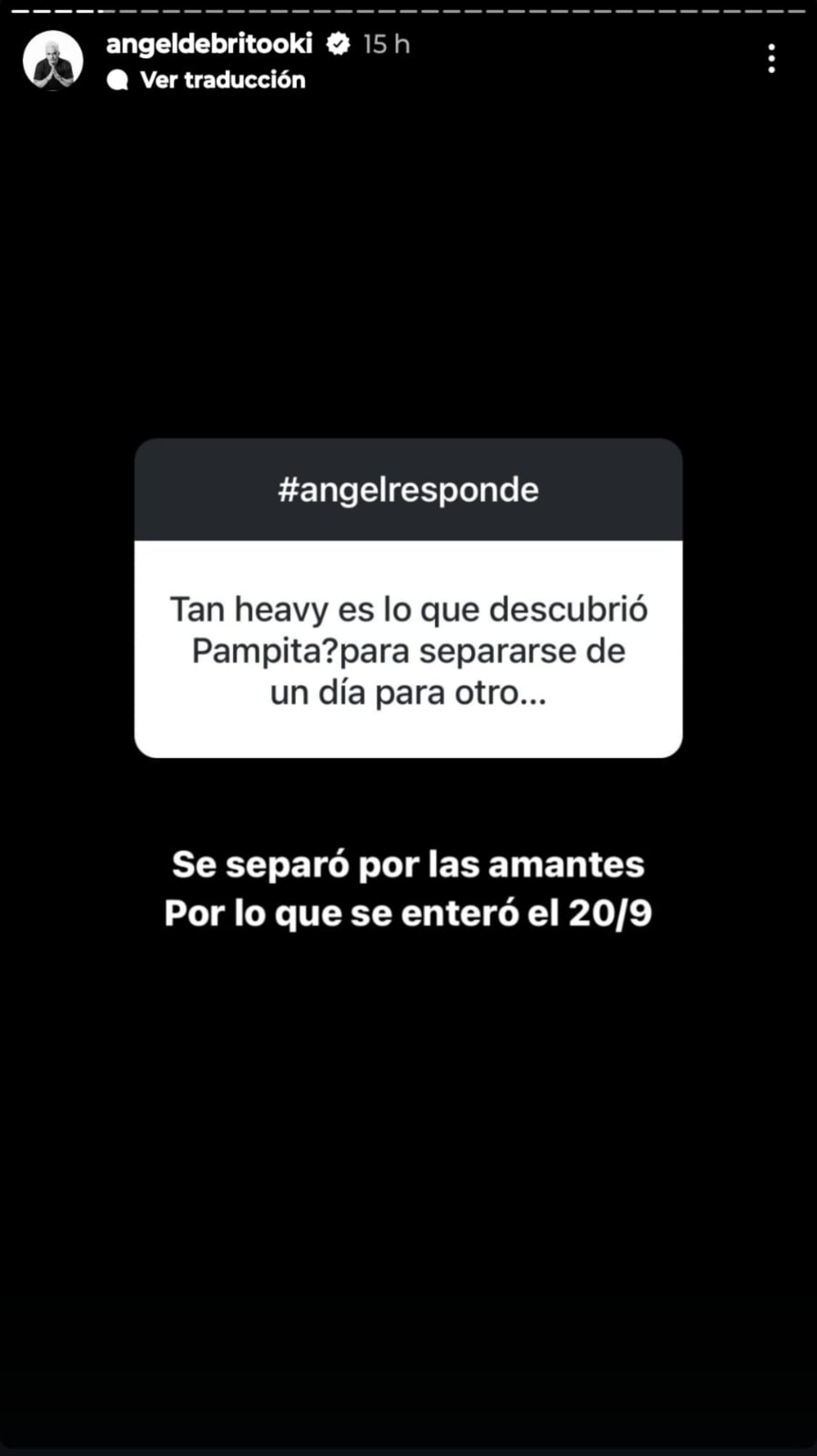 Este domingo, Ángel de Brito compartió en sus historias de Instagram (@Angeldebritooki) un sticker de preguntas para que sus seguidores le hicieran cualquier consulta. Y, obviamente, varios preguntaron por la escandalosa separación de la modelo y el político.