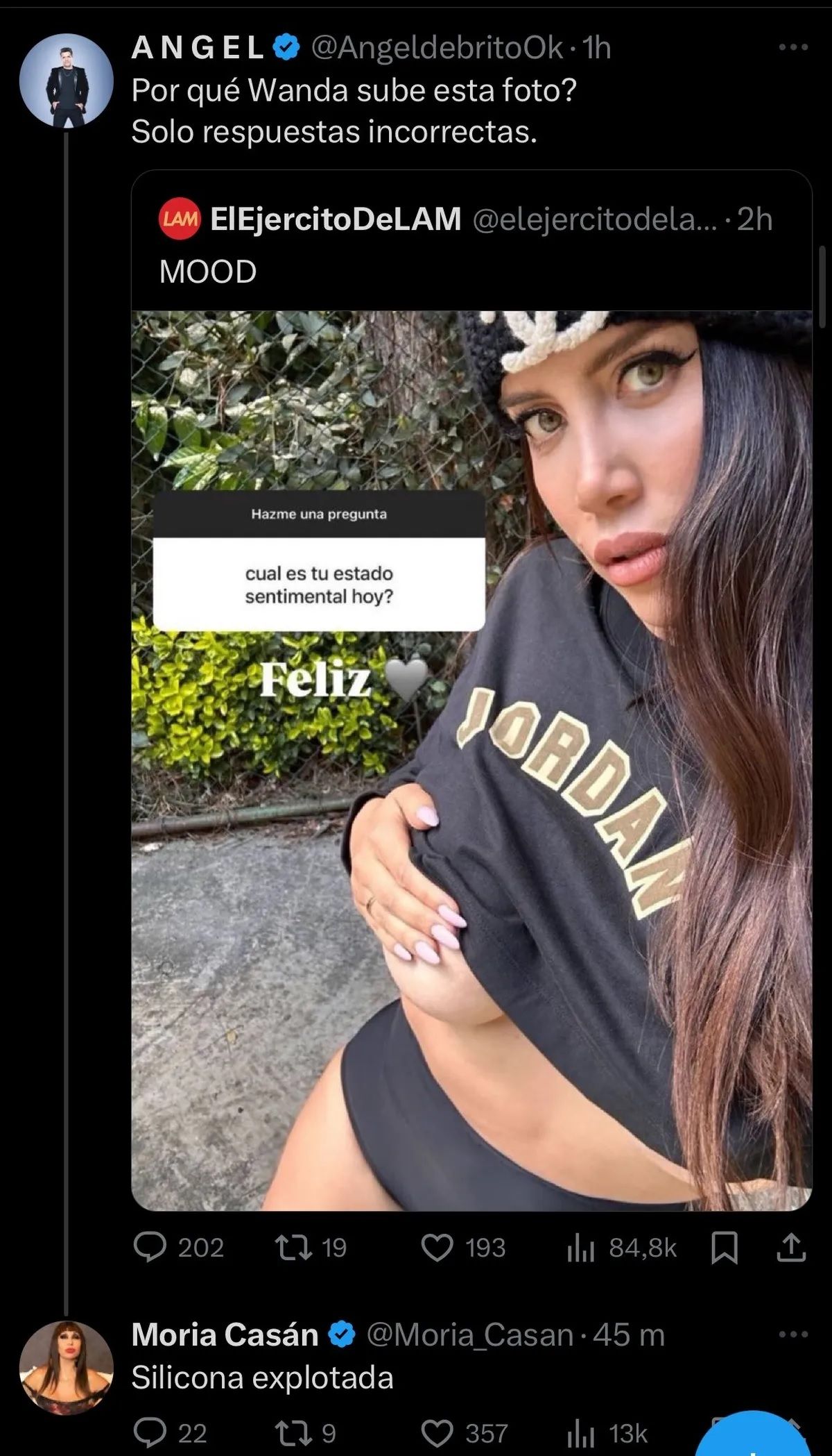 La misma fue compartida por el periodista Ángel de Brito, quien agregó otra pregunta: "¿por qué Wanda sube esta foto? Solo respuestas incorrectas”. Fue allí cuando Moria Casán lanzó el filoso comentario.