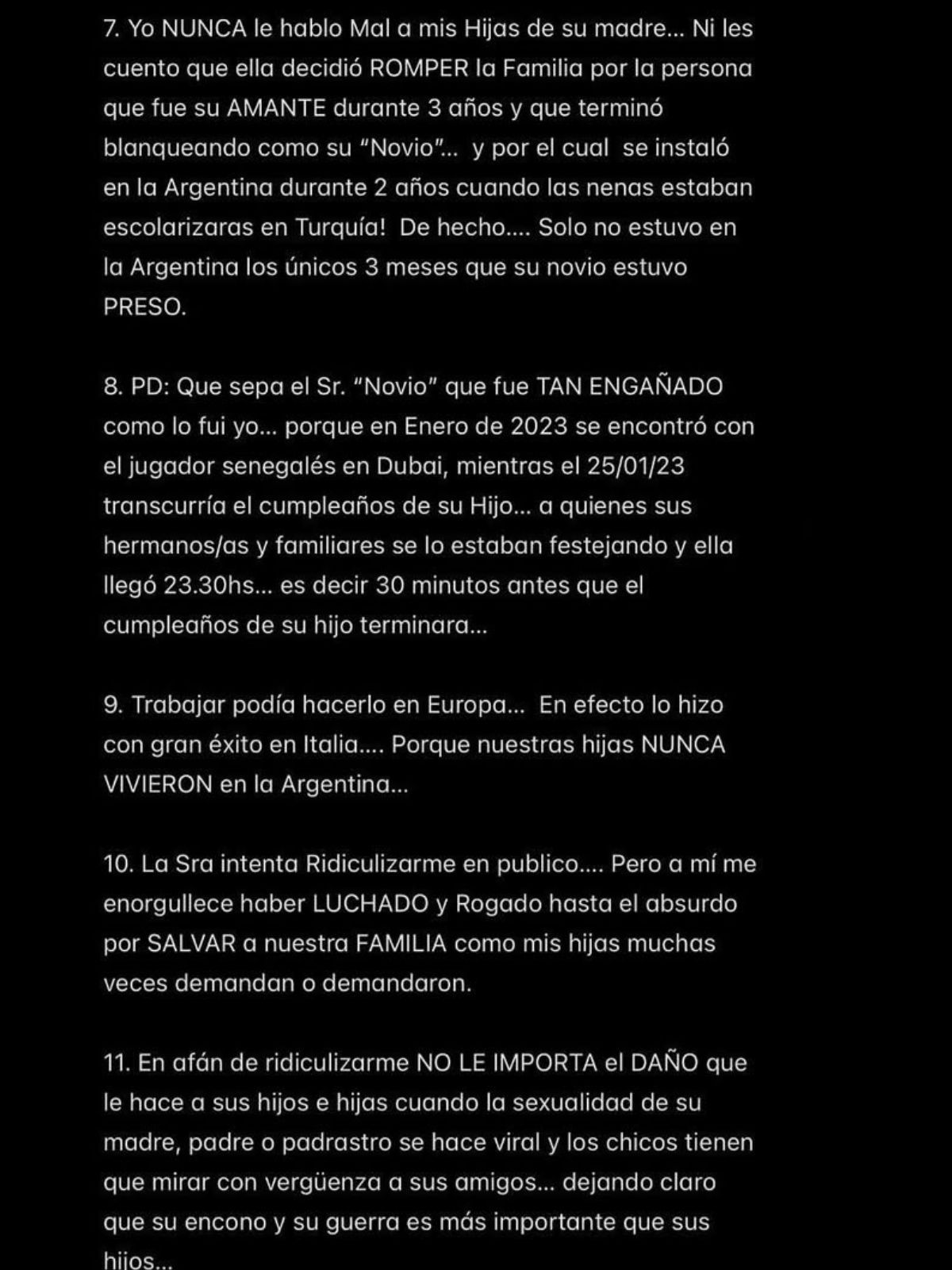 "La señora (NDR: Wanda Nara) intenta ridiculizarme en público... pero a mí me enorgullece haber luchado y rogado hasta el absurdo por salvar a nuestra familia como mis hijas muchas veces demandan o demandaron", se lee en el punto 10.