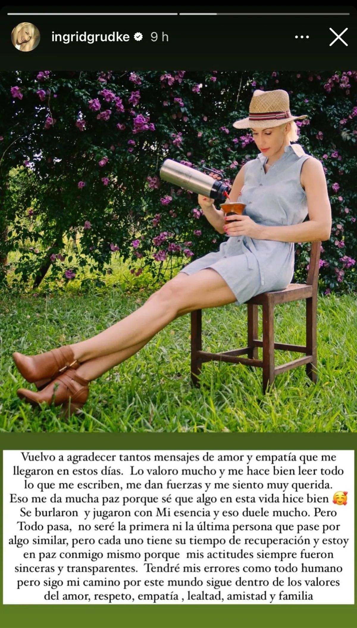 “Vuelvo a agradecer tanto mensajes de amor. Lo valoro mucho y me hace bien leer todo lo que me escriben, me dan fuerza y me siento muy querida. Eso me da mucha paz porque sé que algo en esta vida hice bien”, enfatizó Ingrid Grudke en el mensaje que acompañó en la foto de la historia de Instagram que compartió con sus seguidores.