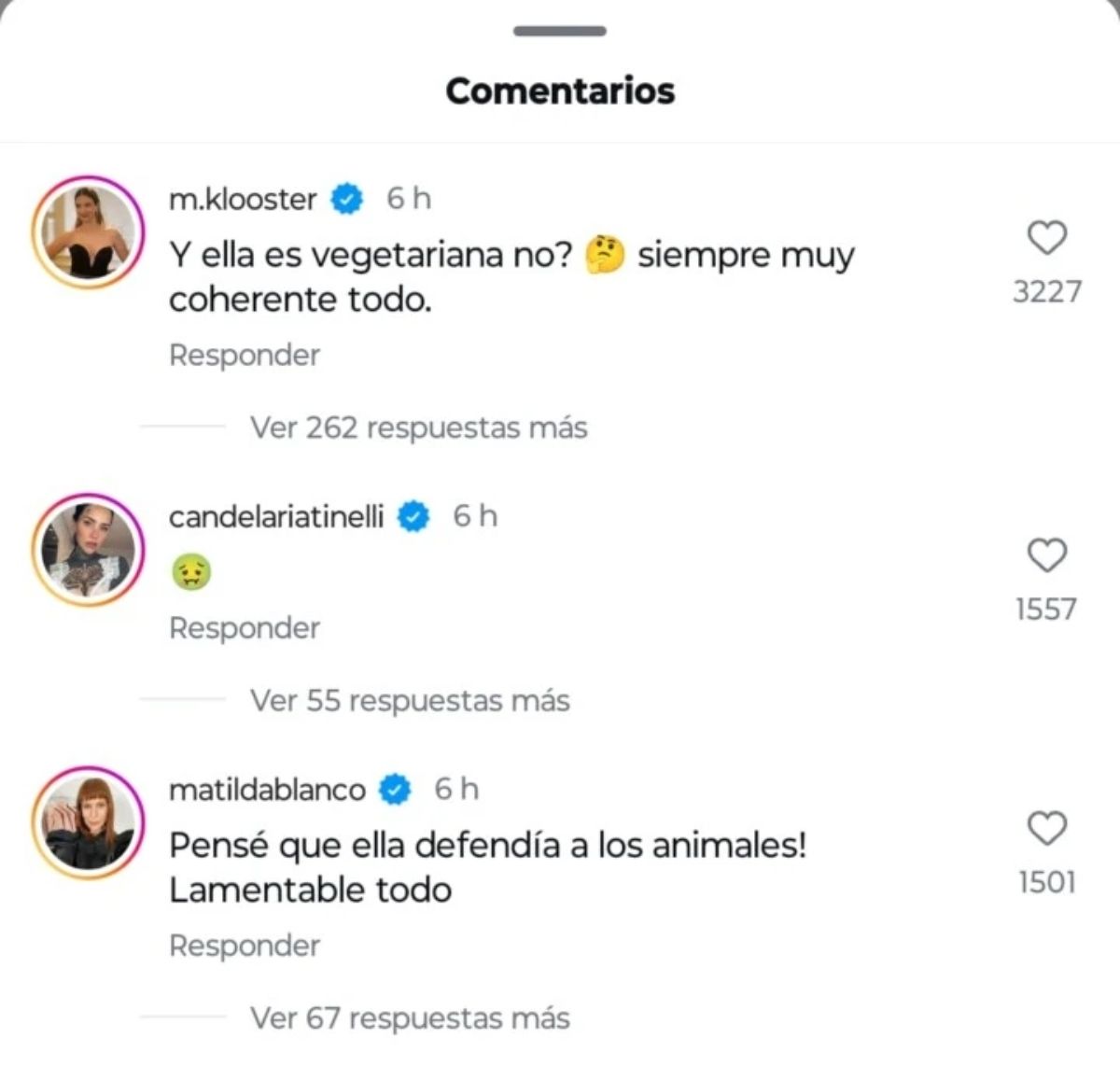 Las últimas en pronunciarse sobre el escándalo fueron Marcela Kloosterboer, Matilda Blanco y Cande Tinelli, quienes reaccionaron a los videos de Mauro Icardi cazando con sus hijas y se refirieron a la China Suárez, quien habló en el pasado en defensa de los derechos animales. "¿Y ella es vegetariana no? Siempre muy coherente todo", comentó Kloosterboer, mientras que la experta en moda opinó "Pensé que ella defendía a los animales. Lamentable todo" y la hija de Marcelo Tinelli se limitó a un emoji vomitando.