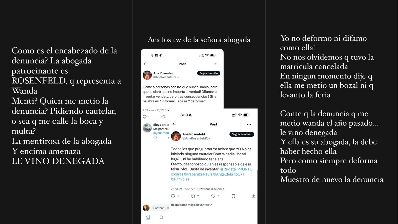 Ante las palabras de la letrada, Latorre explotó: "Me levanto, leo Twitter y como siempre Rosenfeld mintiendo y me desmiente. A ver, vamos de nuevo que a la señora le cuesta entender. La denuncia salió en diciembre. Me pedían multa y cautelar. La abogada patrocinante de Wanda la pidió. Nunca dije que haya levantado ninguna feria. Como siempre, tengo razón", comenzó escribiendo en Instagram.
