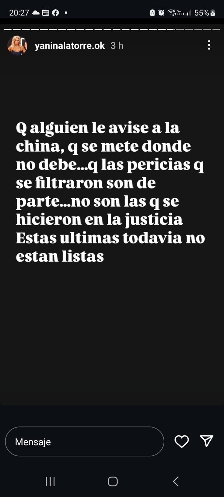 En la siguiente historia de Instagram la picante panelista de LAM, continuó su posteo contra la actual pareja de Mauro Icardi disparando: "Que alguien le avise a La China que se mete donde no debe... Que las pericias que se filtraron son de parte, no son las que se hicieron en la Justicia. Estas últimas todavía no están listas".
