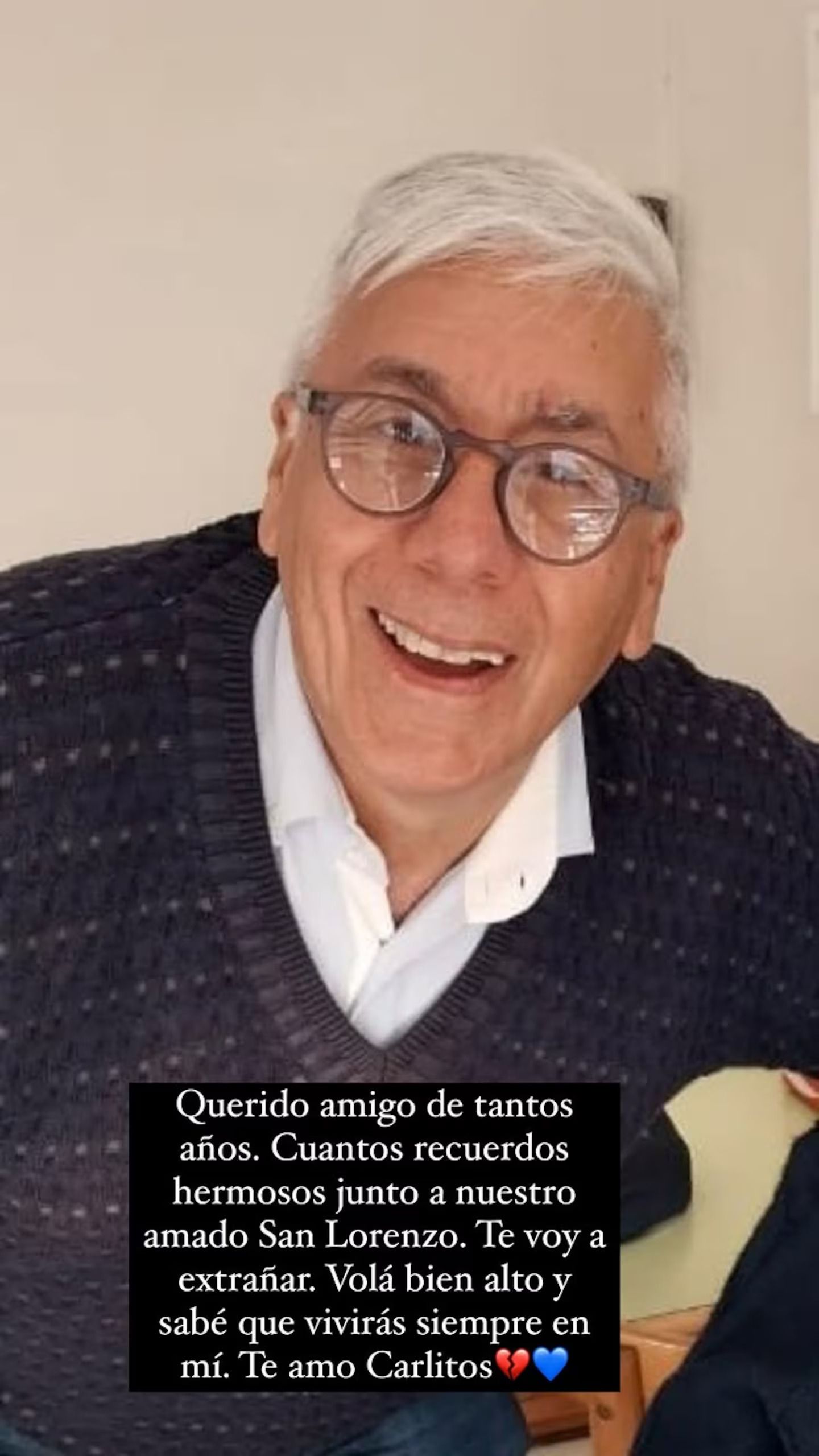"Querido amigo de tantos años. Cuantos recuerdos hermosos junto a nuestro amado San Lorenzo. Te voy a extrañar. Volá bien alto y sabé que vivirás siempre en mí. Te amo Carlitos", escribió. De esta manera, el conductor del Bailando le dijo adiós a su ser querido, sin dar a conocer su identidad, ya que se trata de alguien que no es del mundo del espectáculo.