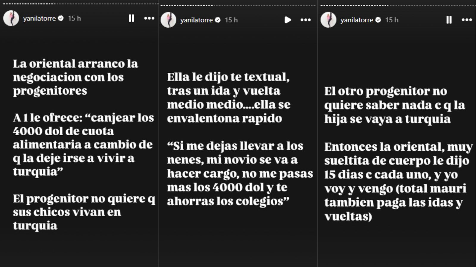 Firme en su idea de mudarse, la China habría abierto negociaciones con los padres de sus hijos. Latorre reveló información clave de la charla de la actriz con Benjamín Vicuña, quien odia a Mauro Icardi y será difícil de convencer: "A uno le ofrece "canjear los 4 mil dólares de cuota alimentaria a cambio de que la deje irse a vivir a Turquía". El progenitor no quiere que sus chicos vivan en Turquía".