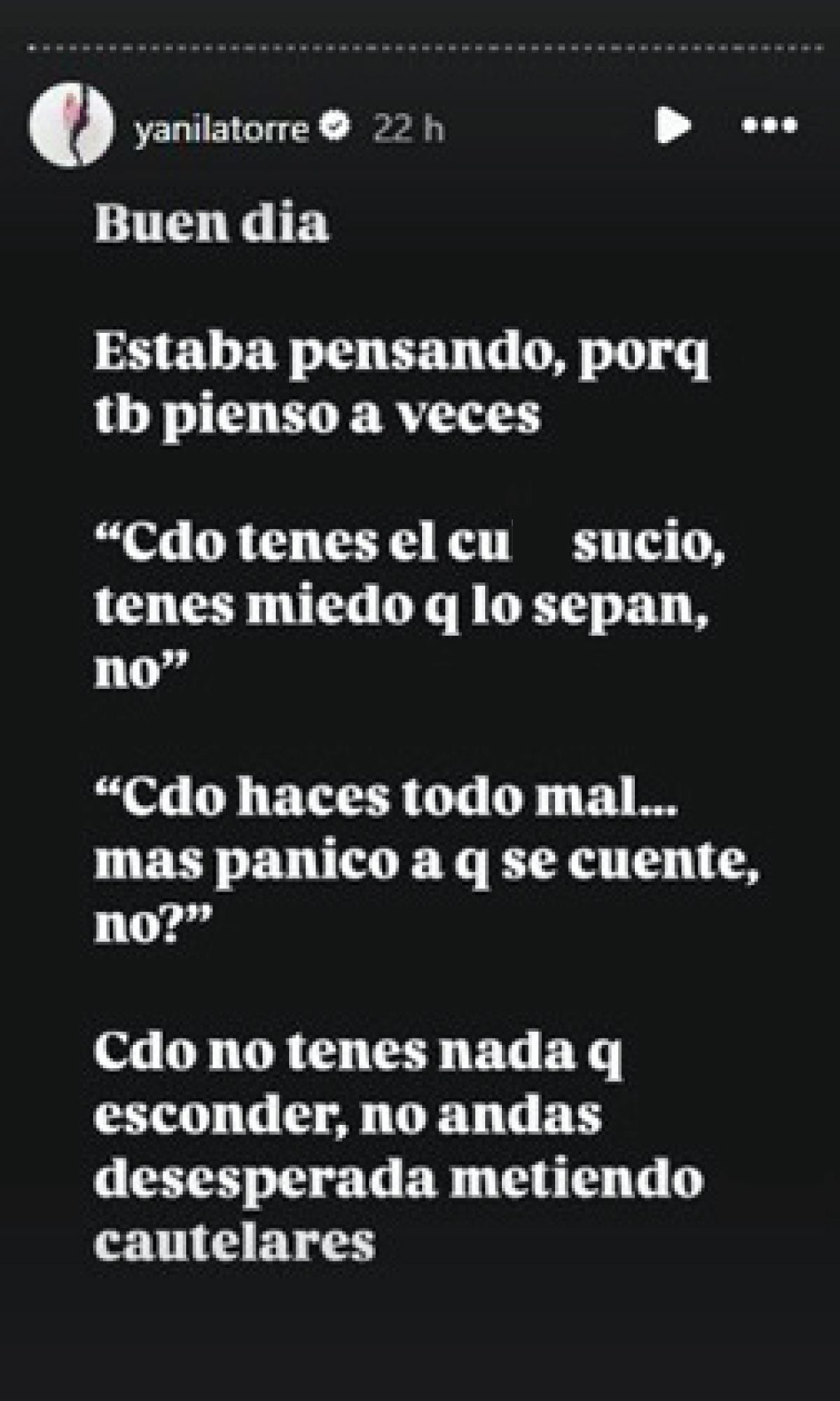 Sin dejar pasar la oportunidad, Yanina respondió con dureza a través de sus historias en Instagram. "Cuando tenés el cu… sucio, tenés miedo que lo sepan. Cuando hacés todo mal, más pánico a que se cuente. Cuando no tenés nada que esconder, no andás desesperada metiendo cautelares", escribió.