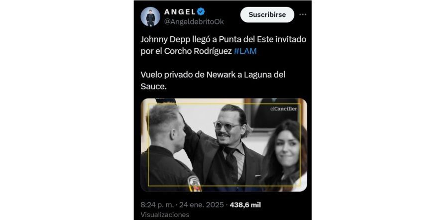 Ángel de Brito compartió en su cuenta de X la información sobre el arribo del astro de Hollywood expresando: "Johnny Depp llegó a Punta del Este invitado por el Corcho Rodríguez", el marido de Verónica Lozano. La cuenta de Instagram de Jorge Rodríguez da prueba de la amistad con el actor ya que el empresario compartió imágenes junto a Depp disfrutando de algunos tragos.