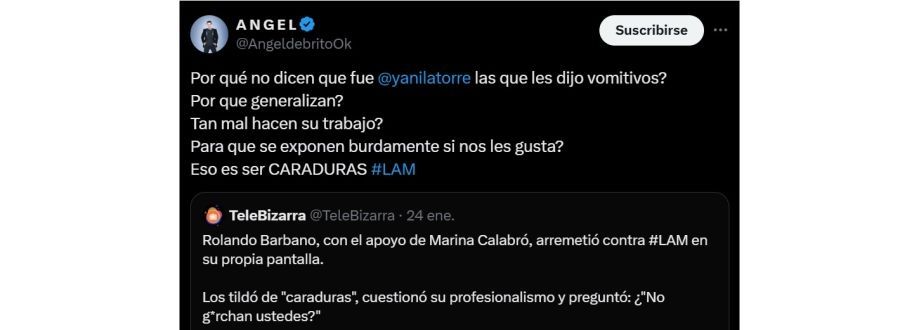 Ángel de Brito no dudó en responder a las críticas que su programa recibió, por ello utilizó su cuenta de X para lanzar su contundente descargo por los dichos de sus colegas hacia LAM esgrimiendo: "¿Por qué no dicen que fue @yanilatorre las que les dijo vomitivos? ¿Por qué generalizan? ¿Tan mal hacen su trabajo? ¿Para que se exponen burdamente si nos les gusta? Eso es ser CARADURA".
