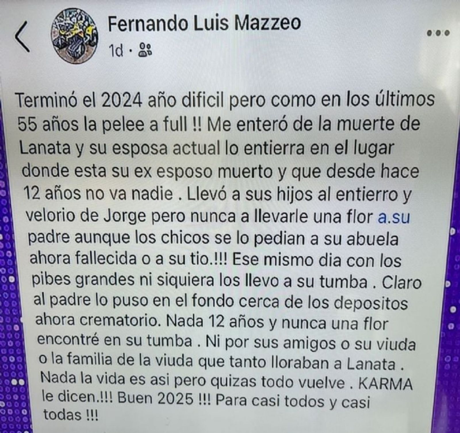 "Terminó el 2024, año difícil, ¡¡¡pero como en los últimos 55 años la pelee a full!! Me enteró de la muerte de Lanata y su esposa actual lo entierra en el lugar donde esta su exesposo muerto y que desde hace 12 años no va nadie. Llevó a sus hijos al entierro y velorio de Jorge, ¡¡¡pero nunca a llevarle una flor a su padre aunque los chicos se lo pedían a su abuela ahora fallecida o a su tío!!! Ese mismo día con los pibes grandes ni siquiera los llevo a su tumba. Claro, al padre lo puso en el fondo cerca de los depósitos, ahora crematorio. Nada, 12 años y nunca una flor encontré en su tumba. Ni por sus amigos o su viuda o la familia de la viuda que tanto lloraban a Lanata. Nada, la vida es así, pero quizás todo vuelve. ¡¡¡KARMA le dicen!!! ¡¡¡Buen 2025!!! ¡¡¡Para casi todos y casi todas!!!", expresó Fernando Luis.