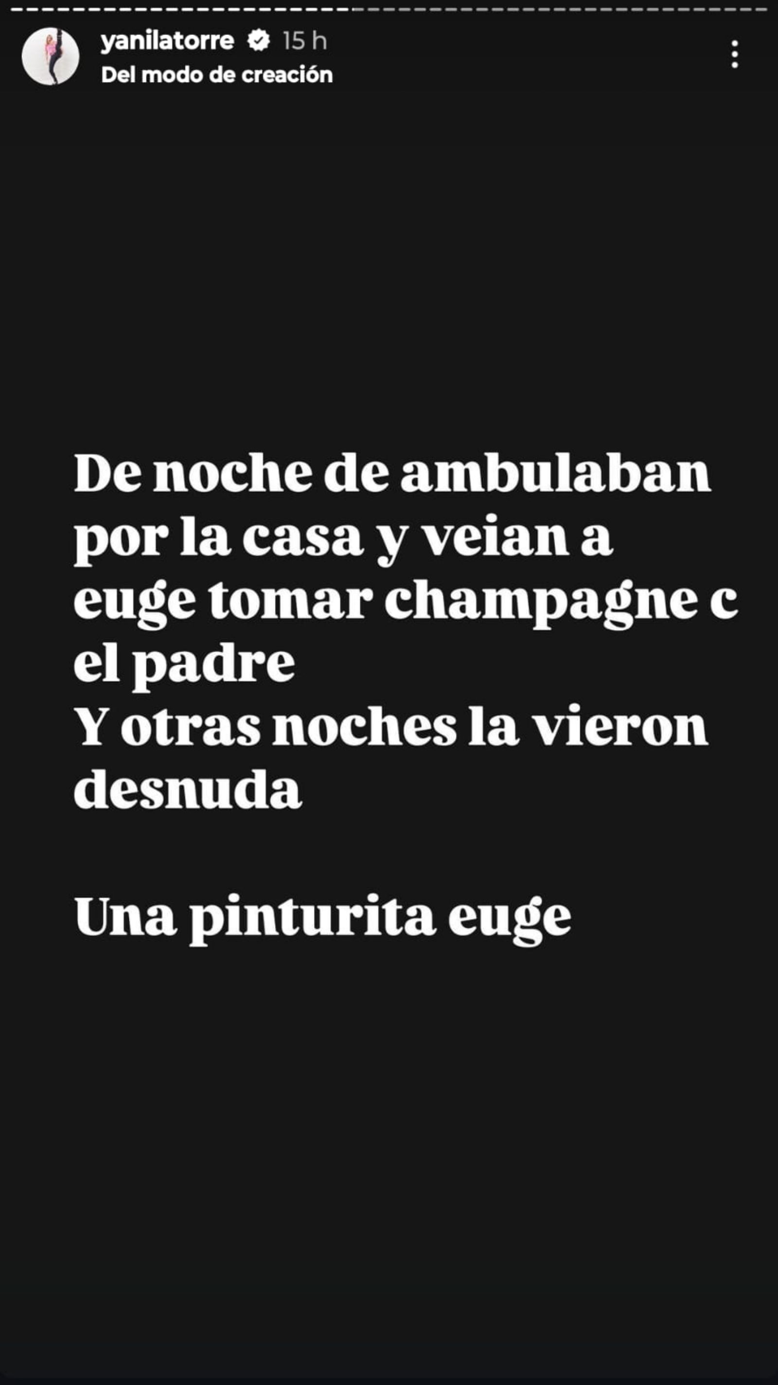"Continúo: las chicas contaron que Amancio, hijo de Euge, dormía con las niñeras en el cuarto de servicio, que Magnolia lloraba mucho y no quería, entonces Euge, se la metía en la cama a Isabella, que dormía en un cuarto con su hermana. Isabella no quería y Euge la obligaba", reveló Yanina.
