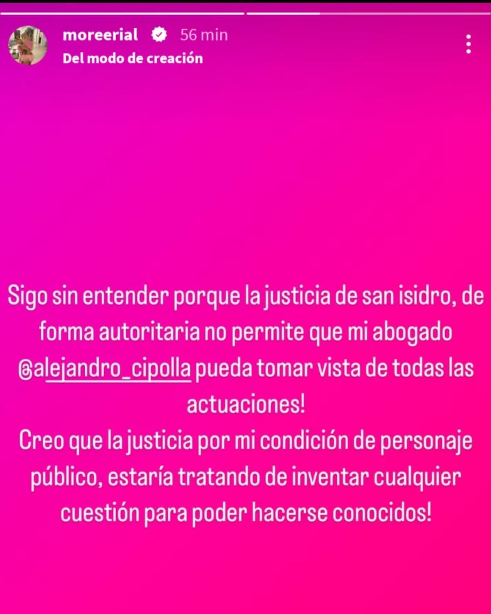 “Sigo sin entender por qué la Justicia de San Isidro, de forma autoritaria, no permite que mi abogado, Alejandro Cipolla, pueda tomar vista de todas las actuaciones. Creo que la Justicia, por mi condición de personaje público, estaría tratando de inventar cualquier cuestión para poder hacerse conocidos”, escribió More Rial en sus redes sociales.