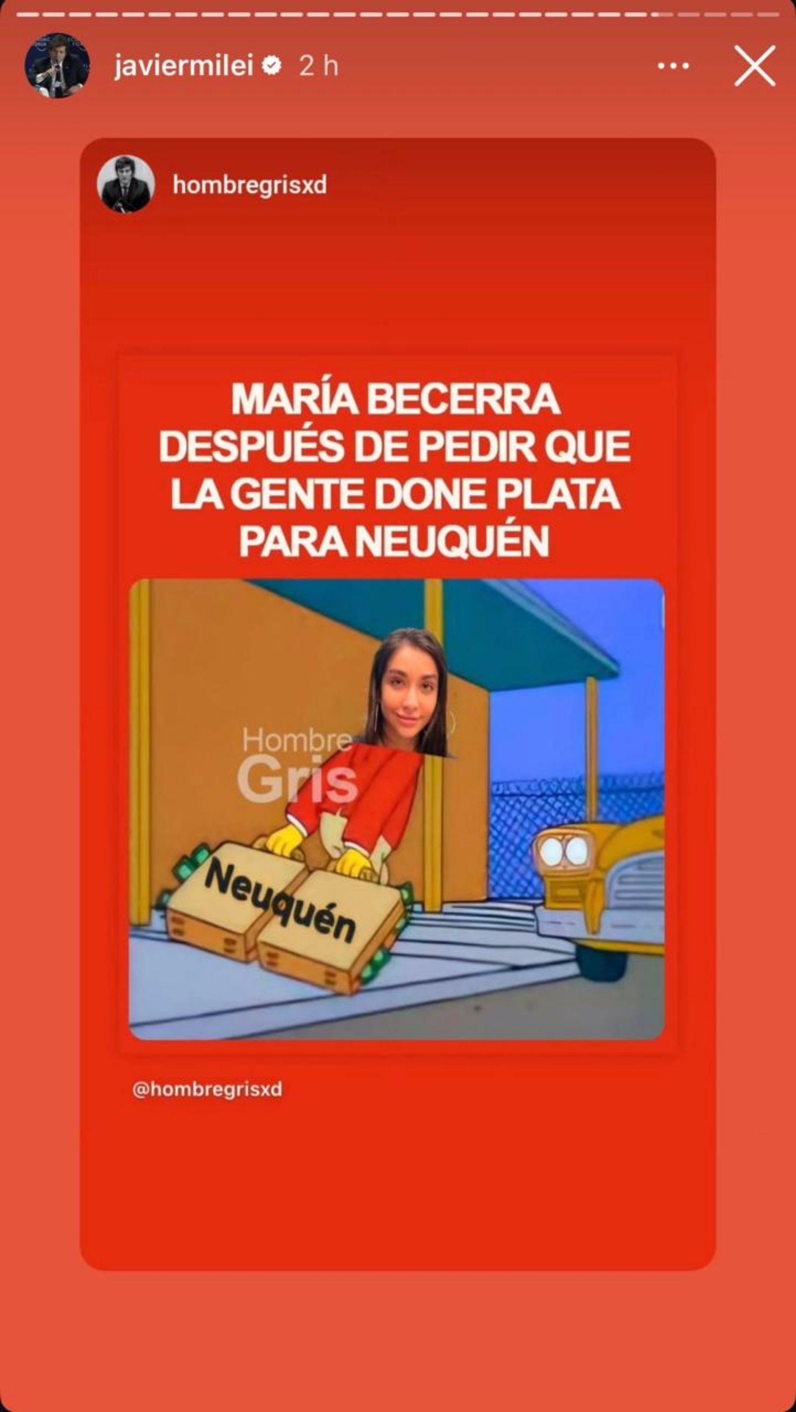 El pasado miércoles 12 de febrero, el líder de La Libertad Avanza le respondió a Becerra compartiendo una imagen editada y publicada por el usuario de Instagram @Hombregrisxd, en donde la artista aparece caminando con dos valijas llenas de dinero, sobre la cuales aparece escrita el nombre de la provincia de Neuquén. La foto original pertenece a una escena muy conocida de Los Simpsons. "María Becerra después de pedir que la gente done plata para Neuquén", es la frase que acompaña la imagen.