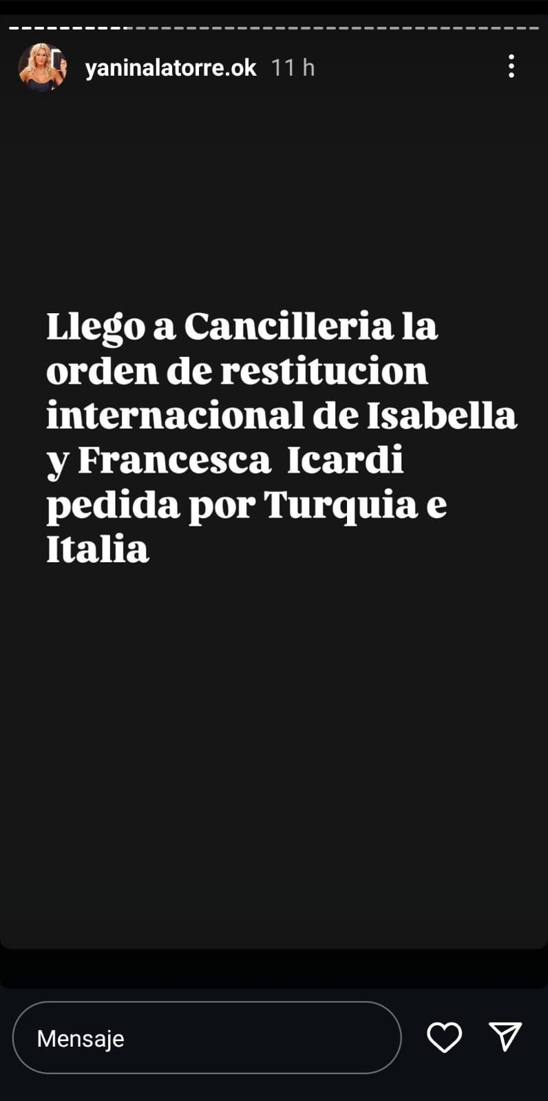 Yanina Latorre también contó en sus clásicas historias de Instagram, que probablemente la tan anunciada actitud de espera con el famoso Tic Tac de Mauro Icardi, que hacía referencia a que aguardaba el resultado de una movida judicial que lo beneficiaría frente a la disputa con Wanda Nara, sería finalmente lo que reveló la penalista en su publicación de este miércoles por la noche que decía: "Llegó a Cancillería la orden de restitución internacional de Isabella y Francesca Icardi pedida por Turquía e Italia".