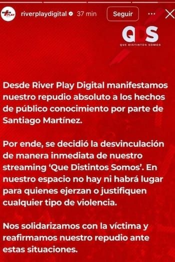 En las últimas horas se conoció que tras la denuncia realizada por Emily Ceco, su marido fue desvinculado de los trabajos en medios de comunicación que había conseguido luego de hacerse famoso en el reality Love is blind Argentina. Uno de los empleos que perdió Santiago Nahuel Martínez fue en El Nueve, en un programa en el que solía desfilar como modelo y el otro por la labor que desempeñó en el medio que difunde noticias de River, club del que es simpatizante Santiago. Así lo anunciaban desde sus redes sociales: “Desde River Play Digital manifestamos nuestro repudio absoluto a los hechos de público conocimiento por parte de Santiago Martínez. Por ende, se decidió la desvinculación de manera inmediata de nuestro streaming ‘Qué Distintos Somos’”.