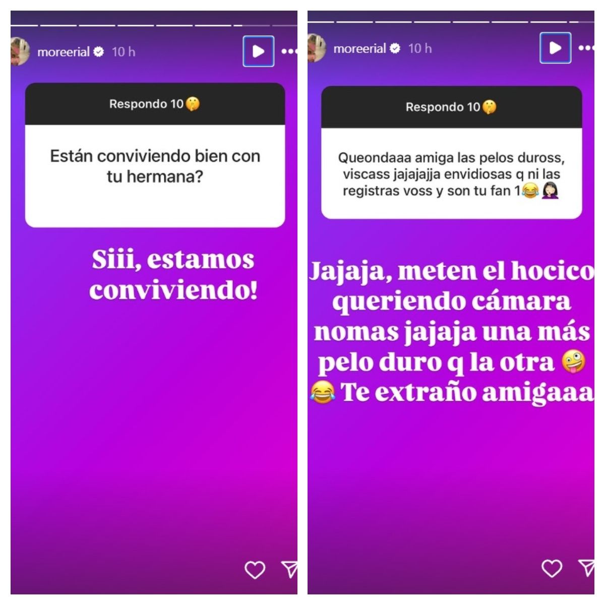 Hasta el momento, contestó la consulta de una seguidora que le preguntó si estaba viviendo con su hermana, y confirmó que sí. Además, se refirió a las amistades que opinan sobre su vida en los medios, tratando el tema con cierto tono irónico.