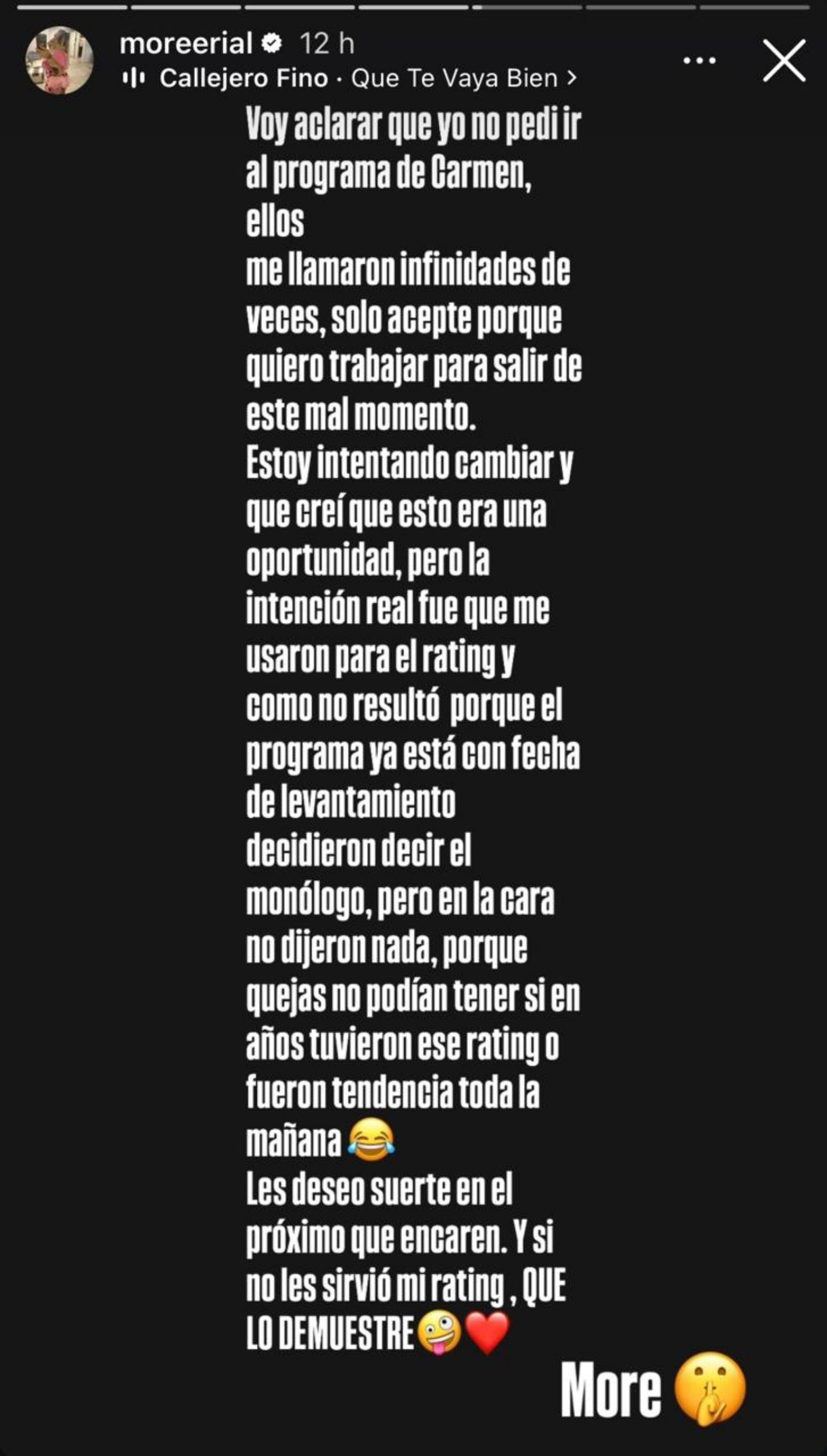 Entonces, Morena Rial le respondió, de manera contundente, a la artista a través de una historia de Instagram (@Moreerial). "Voy a aclarar que yo no pedí ir al programa de Carmen, ellos me llamaron infinidad de veces, solo acepté porque quiero trabajar para salir de este mal momento", dice la primera parte de su comunicado.