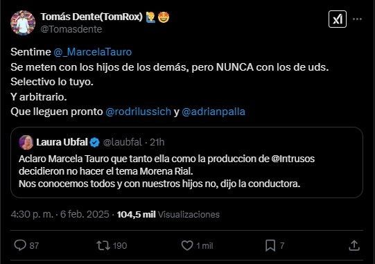 En el video compartido por Ciudad Magazine, se ve a Tomás Dente claramente molesto por que Intrusos no cubrió el caso de Morena Rial, entonces agregó: "Cualquier tipo de excusa que puedan llegar a manifestar creo que va a ser insuficiente". Ni Marcela Tauro, ni Jorge Rial, así como tampoco Luis Ventura, Marcelo Polino y Luis Piñeiro tuvieron algún tipo de cuidado o escrúpulo al momento de exponer la vida privada de otros".