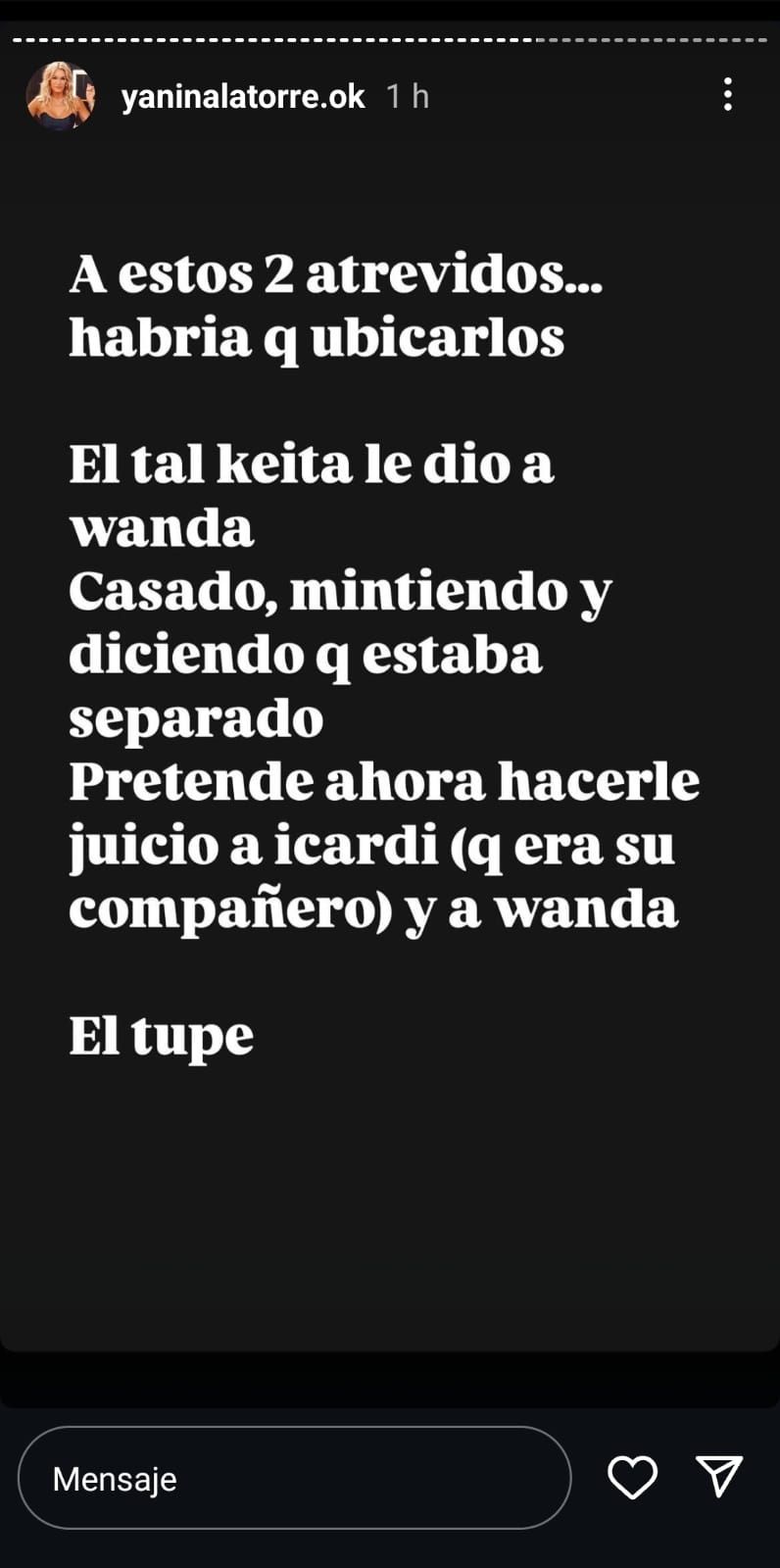 Las picantes publicaciones de Yanina Latorre continuaron con algunas afirmaciones, sobre el romance que el senegalés tuvo con Wanda Nara, en relación a ello exclamó: "A estos 2 atrevidos...habría que ubicarlos. El tal Keita le dio a Wanda, casado, mintiendo y diciendo que estaba separado. Pretende ahora hacerle juicio a Icardi (que era su compañero) y a Wanda. El tupé".