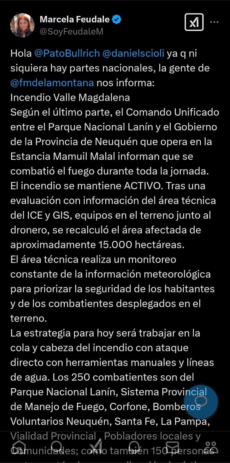"Hola @PatoBullrich @danielscioli ya q ni siquiera hay partes nacionales, la gente de @fmdelamontana nos informa: Incendio Valle Magdalena Según el último parte, el Comando Unificado entre el Parque Nacional Lanín y el Gobierno de la Provincia de Neuquén que opera en la Estancia Mamuil Malal informan que se combatió el fuego durante toda la jornada. El incendio se mantiene ACTIVO. Tras una evaluación con información del área técnica del ICE y GIS, equipos en el terreno junto al dronero, se recalculó el área afectada de aproximadamente 15.000 hectáreas", comenzaba el posteo que realizó Marcela Feudale en el que no sólo brindó información de gran valor, sino que también aprovechó para criticar fuertemente el accionar de las autoridades encargadas de combatir estos tristes acontecimientos, que lamentablemente ocurren todos los años.